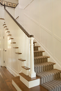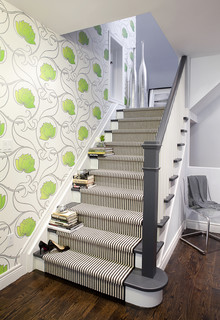 Once I knew the width then I had to figure out whether I wanted the Hollywood edge or the waterfall edge in order to calculate how much length I needed to order. The Hollywood edge is a little more difficult to calculate and install and involves wrapping each tread and pinning it into the riser below it. Kind of like a fitted top. The waterfall edge is more like a lose top, you don’t wrap the edge of each tread and attach the runner where the stair tread and riser meet. Check out the pics below, courtesy of houzz.